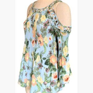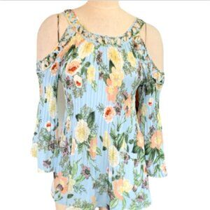 Spense Floral Top Lattice/Cutout Neck Open Shoulder Pleated Flare Sleeve M 14L