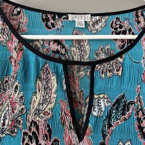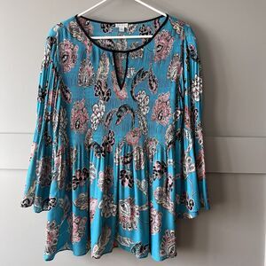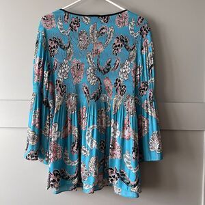Spense Floral Top Women Sz Large Blue 3/4 Bell Sleeve Lightweight Stretch Boho