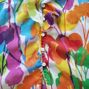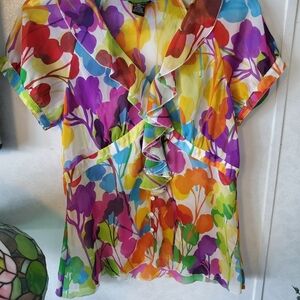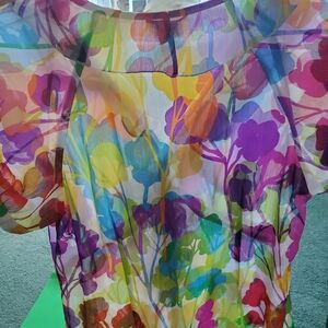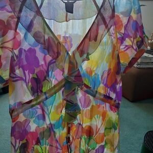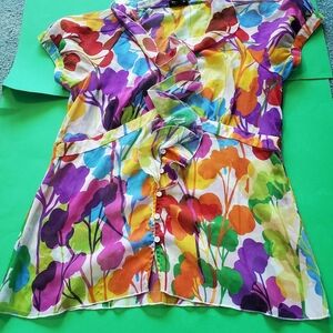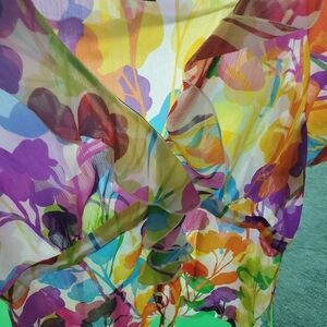Vibrant colorful Sheer ruffle Top. Absolutely beautiful. See all photos for measurements ,style and condition