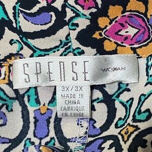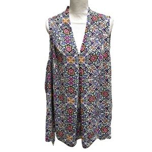 Pretty pink, green, purple, and black pattern. V-neck, hi-low split hem, sleeveless, lightweight. Can be worn alone or layered under a sweater or jacket.