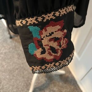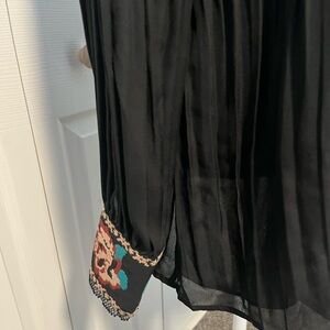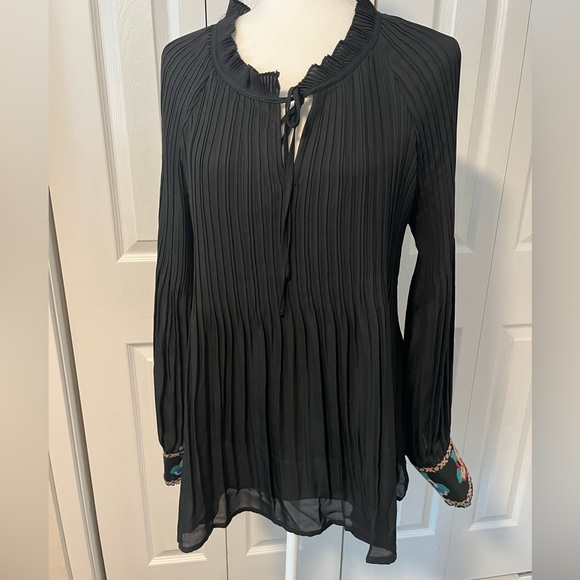 Pleaded front and back for a very flattering look with embroidery on the bottom of both sleeves