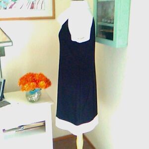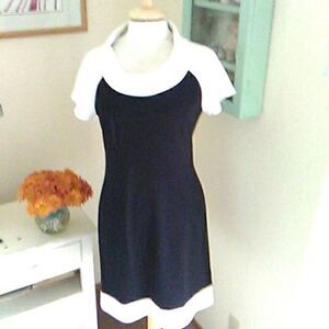 Black and white dress with a retro feel. Rolled collar, raglan sleeves and bottom trimmed in white. Body in black with flattering princess seams. Size 10 measures 38 at chest, 33 at waist, 39 at hips. 36 long from shoulder to hem. Great for work and after.