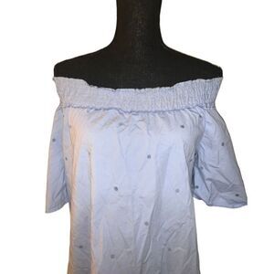 Light blue chambray off the shoulder mini dress. Polka dot front. Elastic neckline. Short sleeves. 97% cotton/3% spandex. Size: medium. Preowned in good condition.