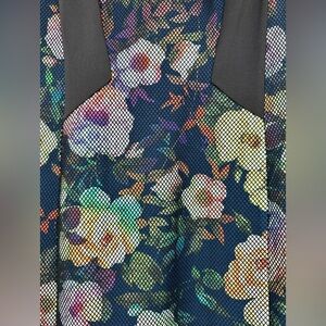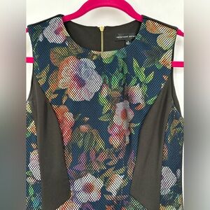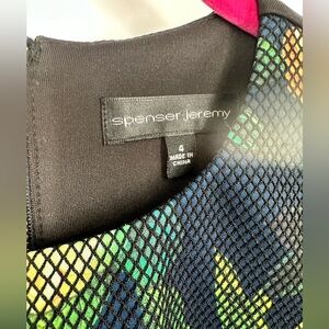 Spencer Jeremy Unique Netted Colorful Floral Sleeveless Dress. Netted overlay over botanical floral print. Gold zipper up the backk. Black accents to for a sexy feminine silhouette. Size 4. Happy to give measurements upon request!