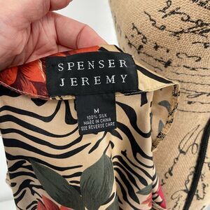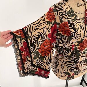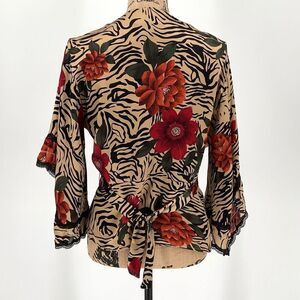 Spenser Jeremy Silk Lace Trim Flutter Sleeve Wrap Top Floral Leopard Tan Medium