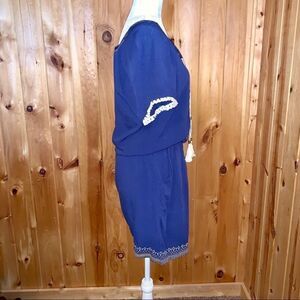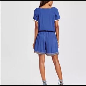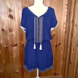 Spenser Jeremy NWOT blue embroidered shirt sleeve romper size 6. On trend. Fully lined. Tassel ties at the neckline trimmed with embroidery. 100% viscose lining 100% cotton. Dry clean. Length 38 inches. Waist 13 inches. Chest 18 inches. Inseam 5 inches.