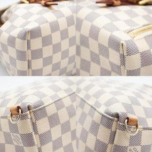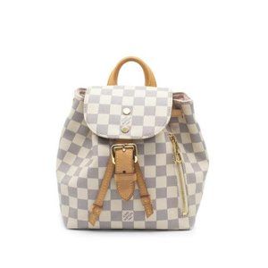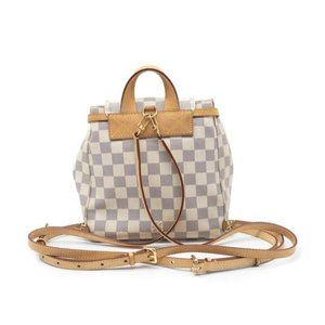 This is an authentic LOUIS VUITTON Damier Azur Sperone BB Backpack. This stylish backpack is crafted of signature Louis Vuitton Damier canvas in blue and white. The backpack features adjustable natural vachetta cowhide leather shoulder straps, top handle, and cinch-cord. The bag also features polished brass hardware, an exterior zip pocket, and a crossover flap with a belt closure. The top opens to a light pink microfiber interior with a patch pocket and a D-ring.