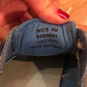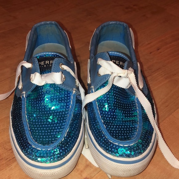 Blue sequin Sperry’s, worn maybe two times, laces in the front, smoke free home.