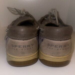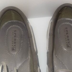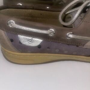 This is a worn pair of Sperry shoes in a grey/beige color. It has small round silver like sequins on each side and a very faint stain on them. Please look at all photos for these are used shoes.