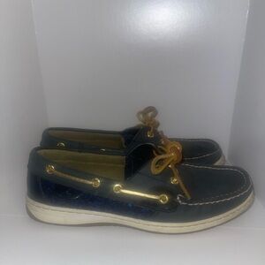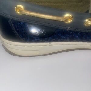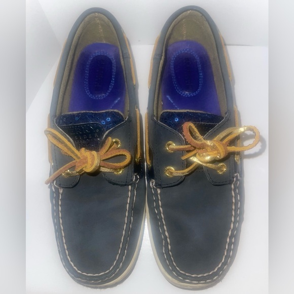 This is a used pair of blue Sperry shoes. It has sequins on each side. Please look at all photos these are a used pair of shoes.
