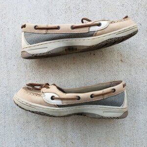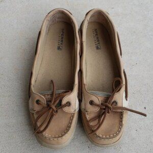 Sperry Top-Sider Tan Classic Boat Shoes (Angelfish) slip on with leather laces and trim, worn a handful of times, size 6M.