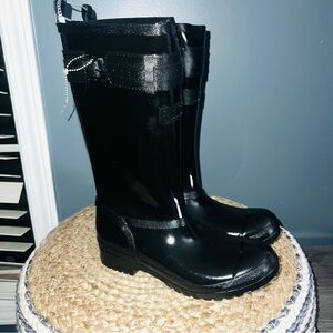 Stylish black rubber boots. Calf high design. Shiny Finish and Feminine Details. Perfect for wet conditions. New without Tags🚭