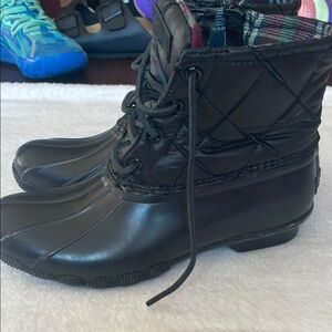Stylish black winter and rain boots. Quilted design with lace-up front. Durable and waterproof.