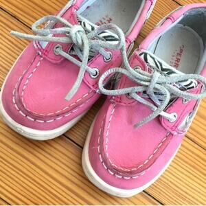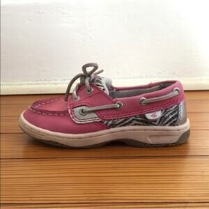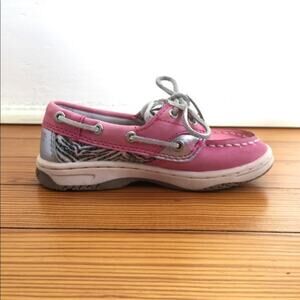 Sperry Bluefish Boat Shoes Pink & Zebra. Light signs of use. Bright pink with silver heels and black and silver zebra print on sides. Easy shoes for a young child to get on and off on her own. Comfortable too! Leather top with a non-marking rubber sole. Like all Sperrys, these are well made and will last a long time!