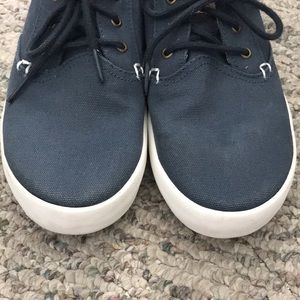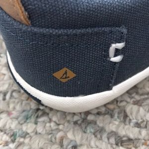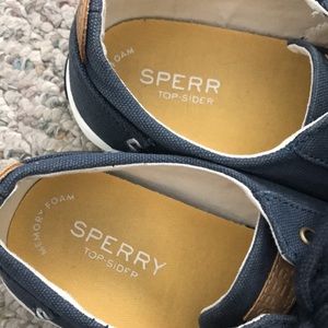 Gently used Sperry Bodie canvas, lace up sneakers in navy blue canvas. Uppers and insoles are in great shape, soles are white and show wear. Cushioned insole. Size 5M.