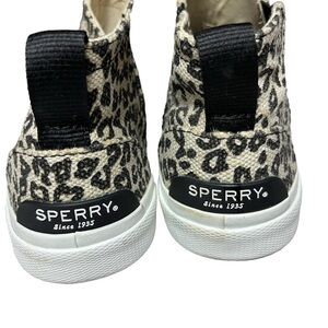 This Sperry slip-on shoe in size 6.5M features a fun cheetah print and easy slip-on closure. Despite some slight imperfections, this shoe remains a stylish and comfortable choice for casual occasions.