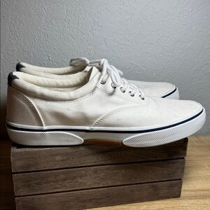 Sperry classic white canvas sneakers with signature wave-siping technology outsole for stability and traction. Men’s size 11. Very good condition, minimal signs of wear. Soles in good shape, no wear down on tread.