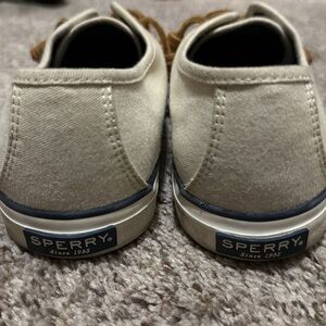 Stylish cream canvas sneakers featuring brown laces. Perfect for casual wear. Worn twice
