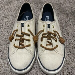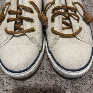 Stylish cream canvas sneakers featuring brown laces. Perfect for casual wear. Worn twice