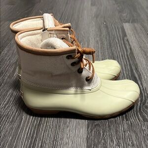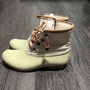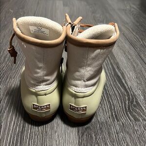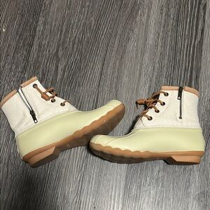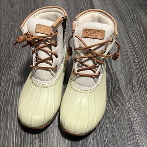 Stylish Sperry ankle boots. Cream upper with tan accents. Durable and comfortable design.