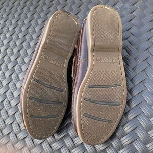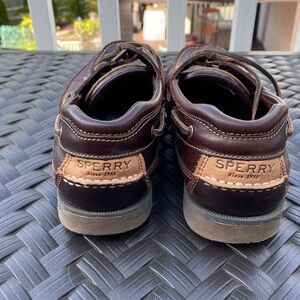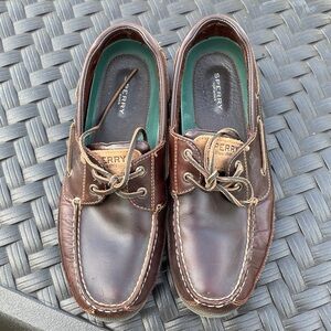 Sperry boat shoes in dark brown leather. Features classic lace-up design.