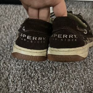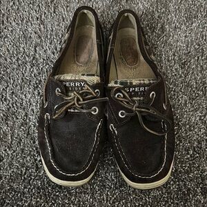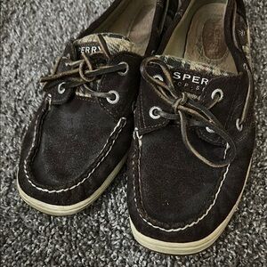 Experience the timeless appeal of Sperry's black boat shoes, featuring a classic moccasin-style construction with visible contrast stitching. These shoes offer a traditional two-eyelet lacing system and a slip-on design, perfect for casual outings. The light-colored soles provide a stylish contrast, enhancing their iconic look.