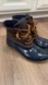 Durable Sperry boots with dark brown leather and navy rubber. Ideal for rainy days.