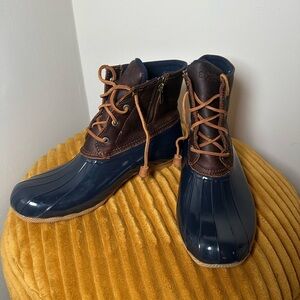 Keep your feet warm and stylish with Sperry Duck Boots. Featuring a classic blue and brown design, these boots are perfect for any adventure.