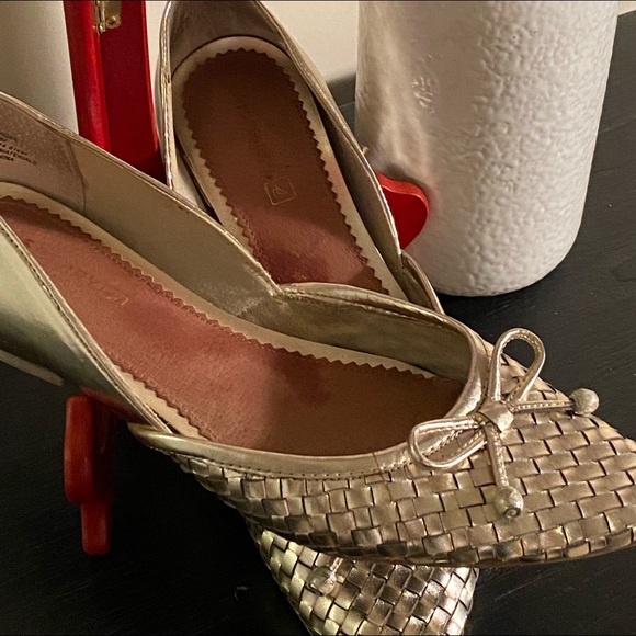 Gold flats with woven detail and bow. Slip-one!! Comfortable as heck!! USED but excellent condition.