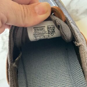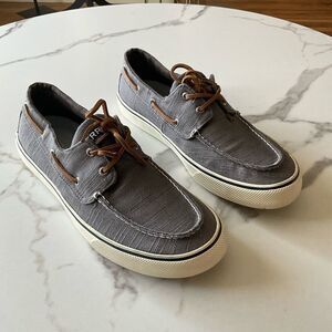Stylish Sperry sneakers. Gray canvas upper. Brown laces and accents. Comfortable and versatile.