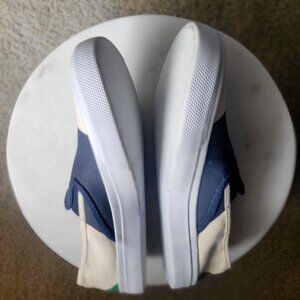 These shoes are a splendid embodiment of casual elegance, crafted with a harmonious blend of beige and navy canvas. The green accent at the heel adds a subtle touch of color, offering a refreshing contrast. Designed with ease in mind, the slip-on style ensures quick and comfortable wear. The shoes feature a sturdy rubber sole, promising durability and grip, perfect for leisurely strolls or laid-back weekends.