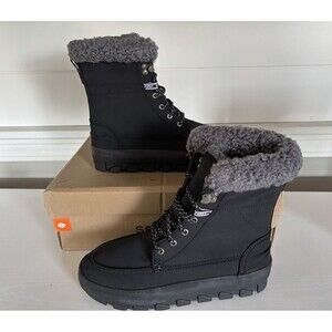 Black waterproof suede upper, Faux fur sherpa trim in gray, Lace up, Above ankle, Round toe, IceTREAD lug sole, Slip on, Comfort