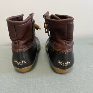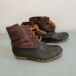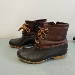 Sperry Kids Saltwater Duck Boots. Unisex kids shoe size 13. Labeled girls, these are definitely unisex style. (I purchased for my son!) Classic, preppy style. Size zipper. Brown leather top. Light wear; bottoms could be cleaned better. So cute for staying warm and dry in fall and winter weather!