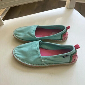 Vibrant aqua canvas with pink watermelon accents. Slip-on style. Perfect for summer fun.