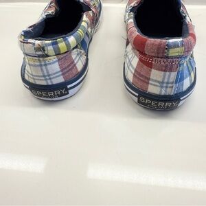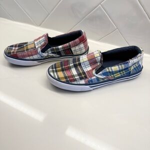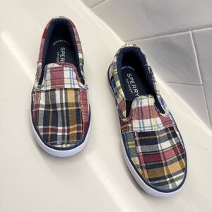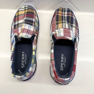 Keywords: Sperry, Striper II, slip-on sneaker, multicolor, plaid, casual, kids, spring, comfortable, fabric upper, rubber outsole, unisex, pre-owned, easy wear, versatile.