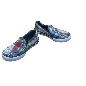 Sperry Kids' Striper Ii Slip on Sneaker, Madras, Size Little Kids 9M. The shoes have normal wear as shown in the photos with no rips or tears. There is marker on the bottom of the shoe but does not effect the wear of the shoe. The midsoles has normal wear also that is shown in the photos. Please see photo for overall condition and wear of the shoes.