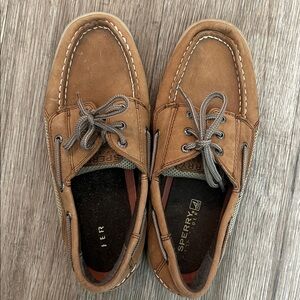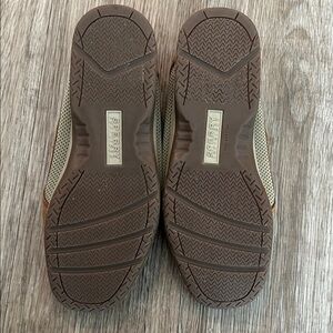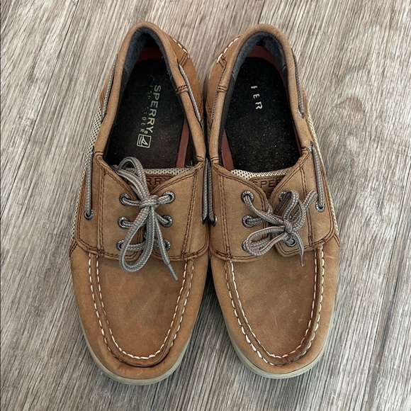 Stylish tan boat shoes. Durable design. Comfortable fit.