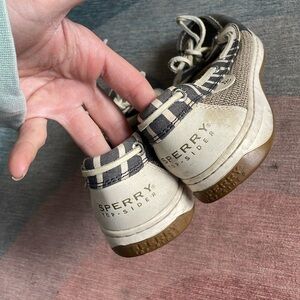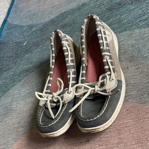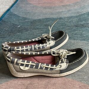 Experience timeless style with these Sperry moccasins, featuring a sleek gray color and classic rawhide leather laces. The moccasin-style toe construction and traditional boat shoe silhouette make them perfect for casual outings or nautical adventures. Enjoy the comfort and durability that Sperry is renowned for. Non Marking Great pre loved condition size 8.5 women's. gentle wear to shoe please see pics as part of description. a lot of life left