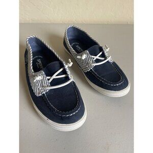 Sperry Navy Blue Canvas Boat Shoes Striped Slip On Nautical Preppy Coastal Beachy Size 7