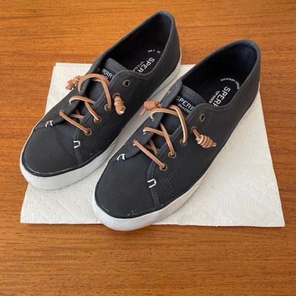 Sperry Pier View sneaker. Navy blue. Original color is slightly faded navy. Perfect summer shoe. Size 8.5 M Rubber non-skid sole. Memory foam food bed. Worn very little. Very good used condition.