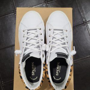 Sperry white leather with cheetah print accent memory foam sneakers, sz 7.5M