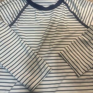 Striped blue and white rash guard 23 inches in length 18 inches pit to pit 22 inches from collar to bottom of shirt 3/4 sleeves No tag