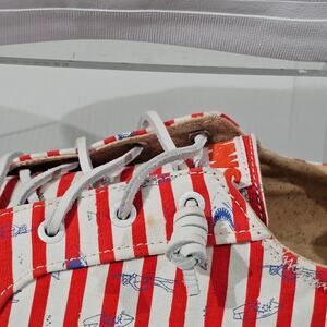 Stylish Sperry athletic shoes with red and white stripes. Comfortable and trendy design. Jaws inspired look. Throw back to the movie