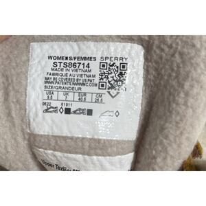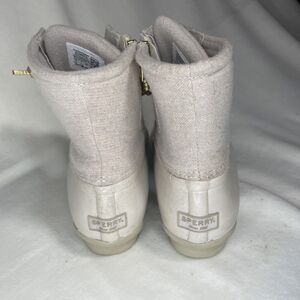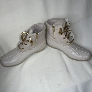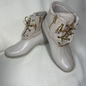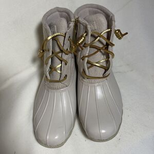 These Sperry rubber boots are designed for women in a beige color with a quilted top. They have a waterproof feature, ankle shaft style, and lace with zip closure. The boots have a wool lining and a comfortable rubber outsole, making them suitable for rainy weather. EUC