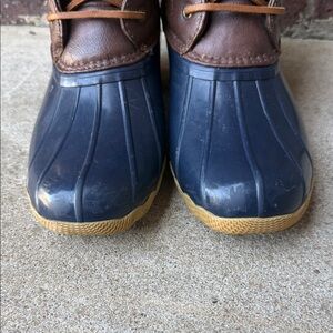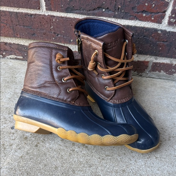 Sperry ankle duck boots. Navy rubber shell with brown leather upper. Tan laces and gold-tone zipper. Rugged outsole for traction.