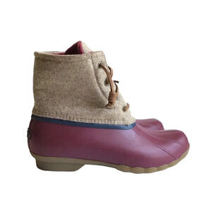 Sperry Saltwater Wool Womens 8 Rain Duck Boots Tan Burgundy Lace Up Fall Winter