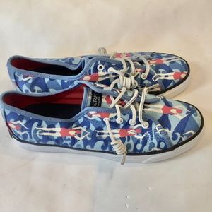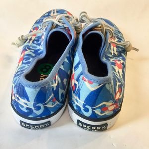 Woman's size 8 Sperry's super fun swimming woman shoes. These unique shoes are comfortable and sturdy. Bright colors, beautiful blue waves, and white accents make these shoes too adorable. Very good condition. Offers welcome.