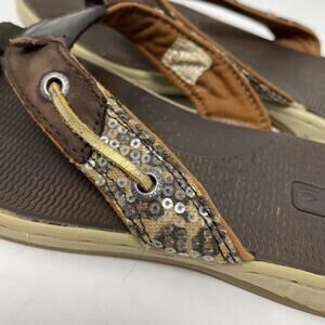 Sperry Seafish Thong Sandals. Size 8. Brown suede leather upper and balance manmade. Sequin embellishments. Shoes are preowned with some signs of wear but still perform as intended. Priced accordingly.