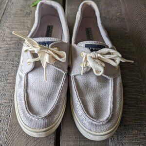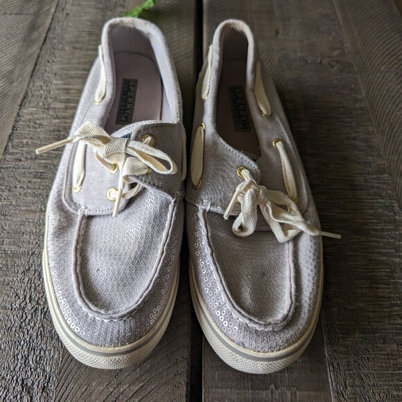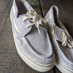 Sperry Sequin Sparkle Glitter Silver Gray Deck Boat Slip on Shoes Size 8.5