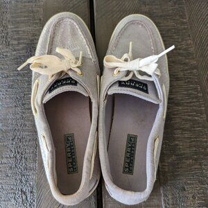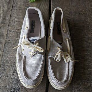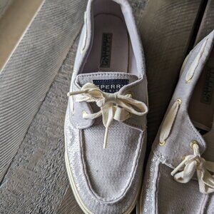 Adorable silver/gray slip on boat deck shoes with sequins that make them sparkle. In great condition with no defects, size 8.5.